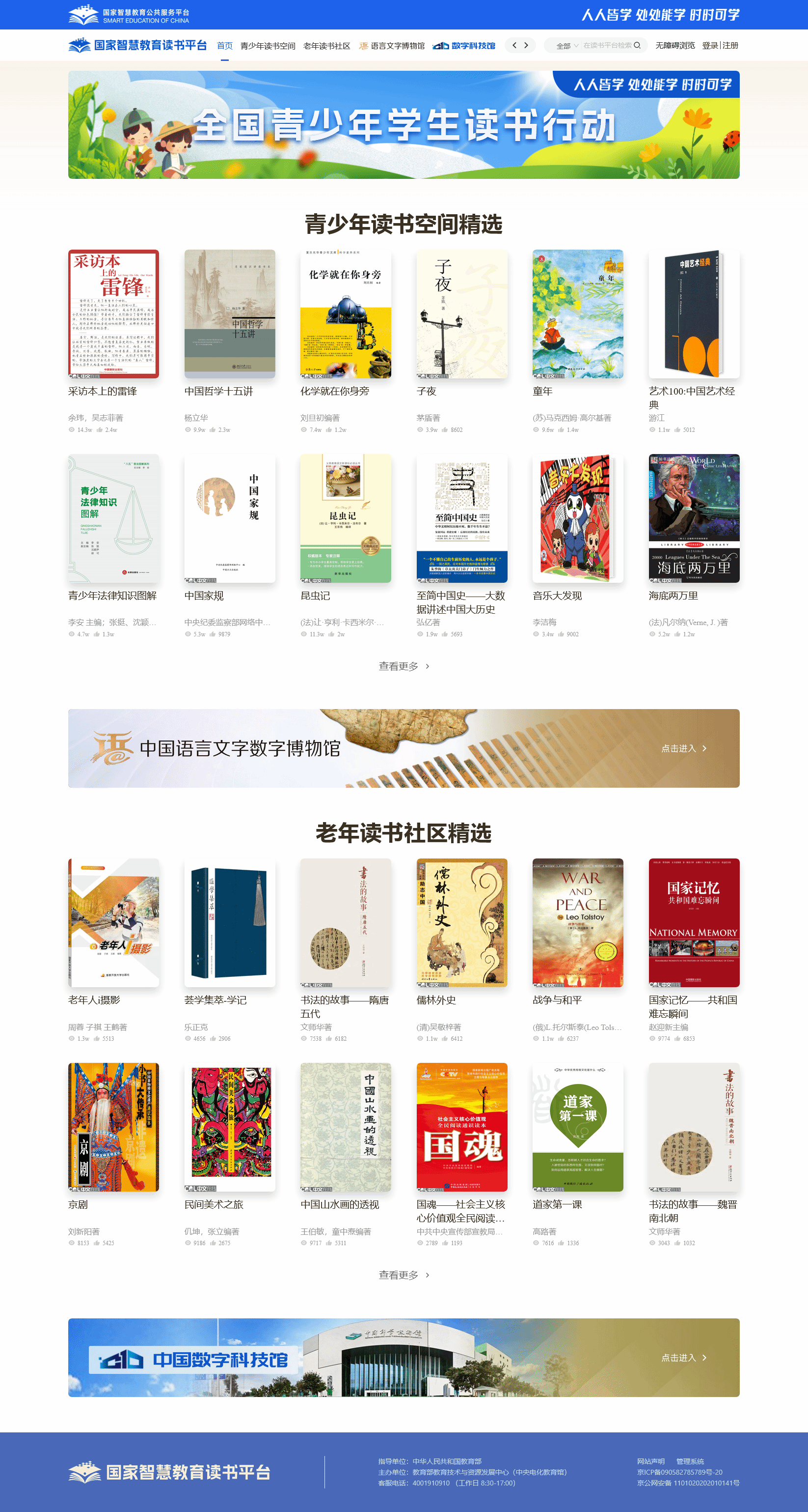 为深入贯彻落实党的二十大关于深化全民阅读活动的重要部署,进一步推动青少年学生阅读,促进全面提升育人水平,服务学习型社会、学习型大国建设,教育部联合相关部门启动实施“全国青少年学生读书行动”,并开通国家智慧教育读书平台(以下简称“读书平台”)。读书平台建设初期设有“青少年读书空间”、“老年读书社区”、“中国语言文字数字博物馆”、“中国数字科技馆”四个版块。读书平台将不断丰富阅读资源,并依托平台开展有关读书活动,助力青少年学生读书行动深入开展。