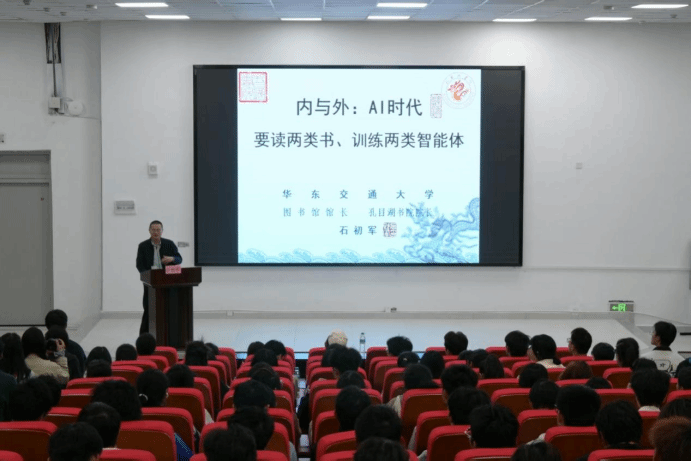 面对AI时代的汹涌浪潮、瞬息万变,大学生如何自处?石初军从人类发展史切入,指出人类独步万物靠的是“外掌科技变化,内守仁爱本质”。他建议学子们要读两类书,一类是数理技艺之书以应世事变化,一类是经史子集之书以固精神根基;还要训练两类智能体,既要用好AI大模型等外在工具,也要修身养性,强化内在身心,让我们在人工智能时代能够不失本心。