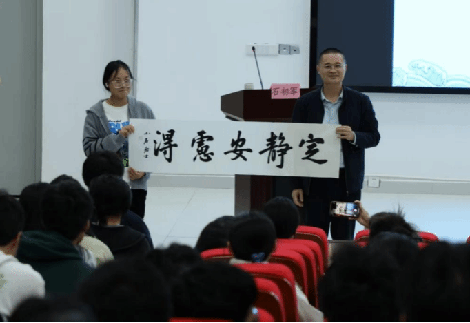 现场互动问答环节气氛热烈,石初军精心准备的十几幅书法作品作为奖品,深受学生喜爱,为讲座增添了浓厚的文化氛围。
