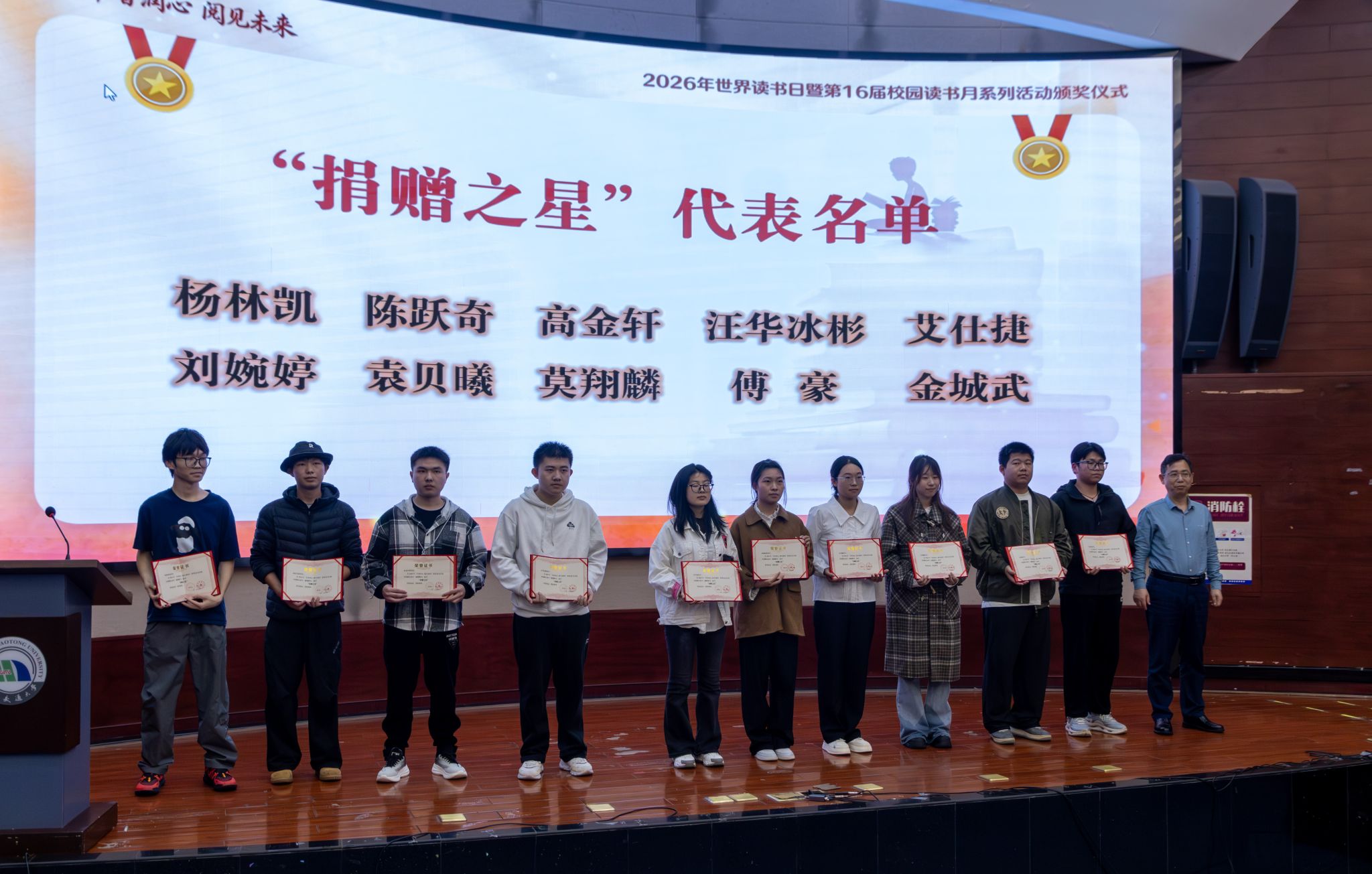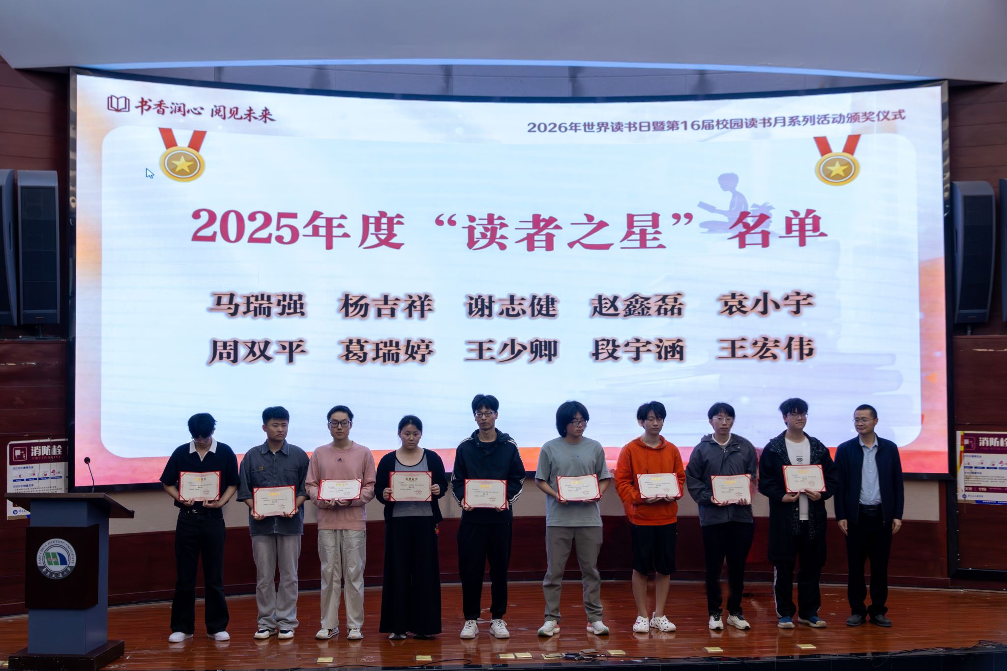 4月22日,我校2026年世界读书日暨第16届校园读书月系列活动颁奖仪式在北区图书馆圆形报告厅举行。校党委委员、副校长吴锦武出席活动。