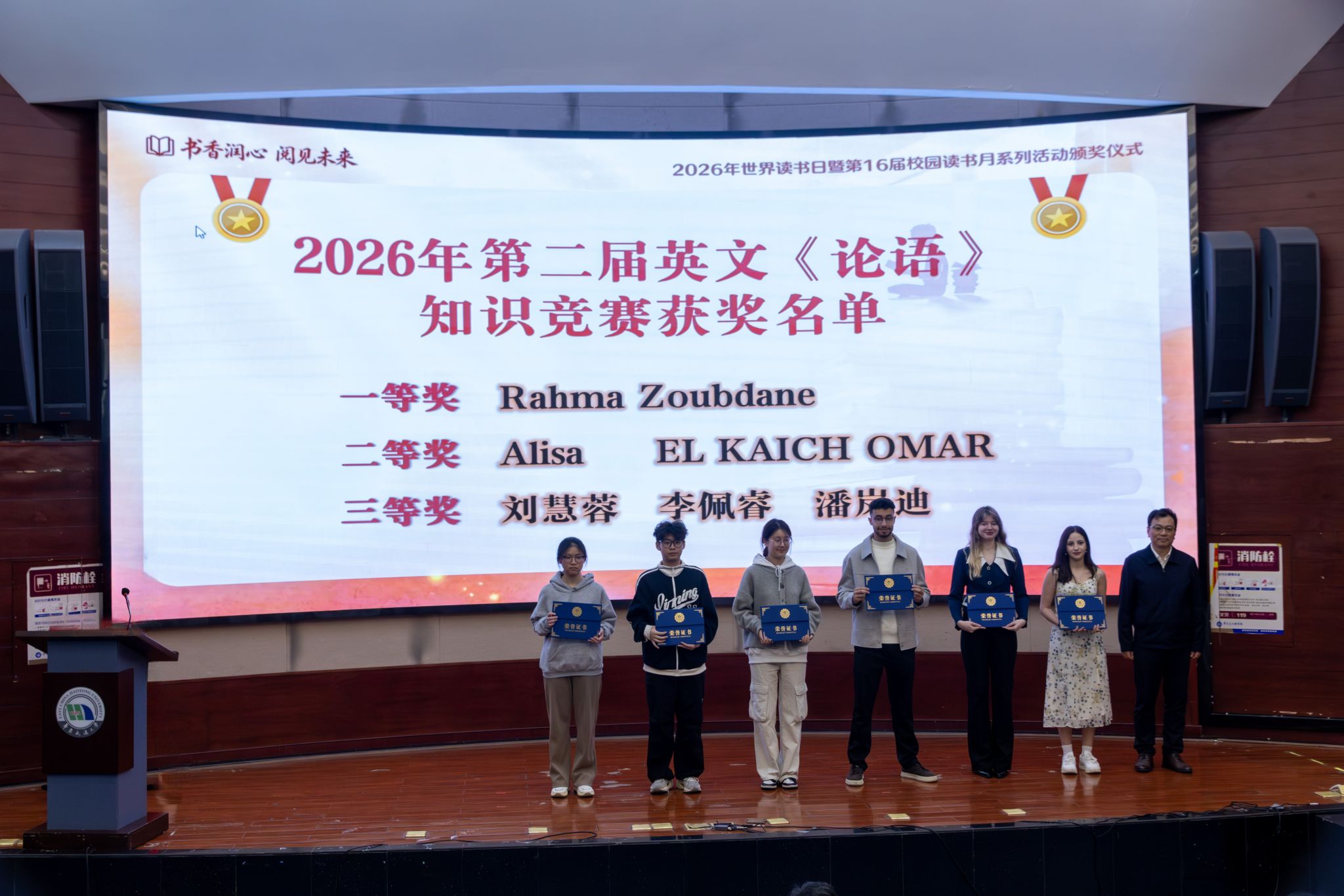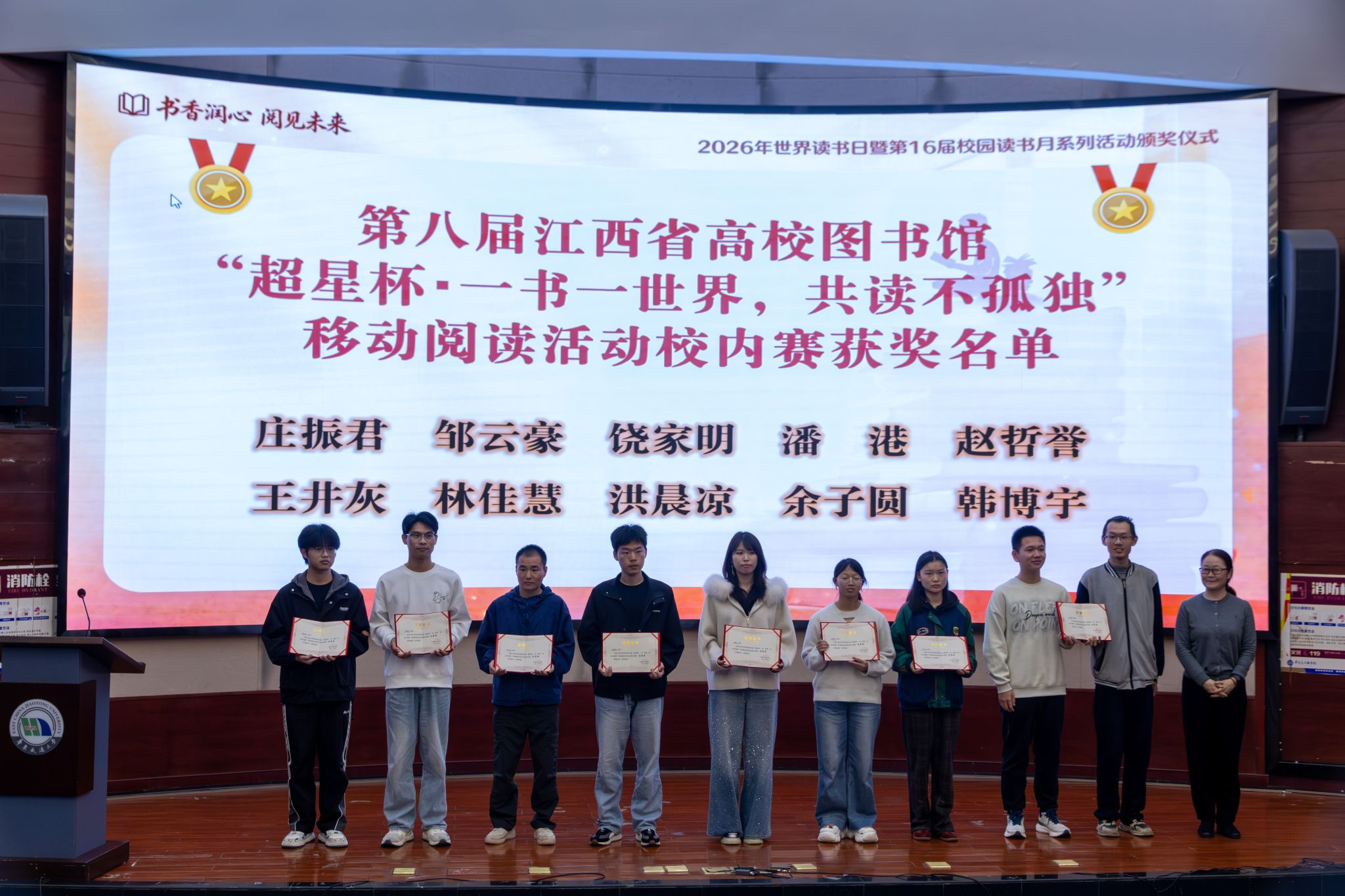 活动现场发布了2025—2026学年第二学期12种推荐阅读书目,举行了“马踏春泥 ——2026 年孔目湖书院书法展”开展仪式,并为“捐赠之星”代表、2025年度“读者之星”、“超星杯”移动阅读活动校内赛获奖者、第二届英文《论语》知识竞赛获奖选手颁奖。