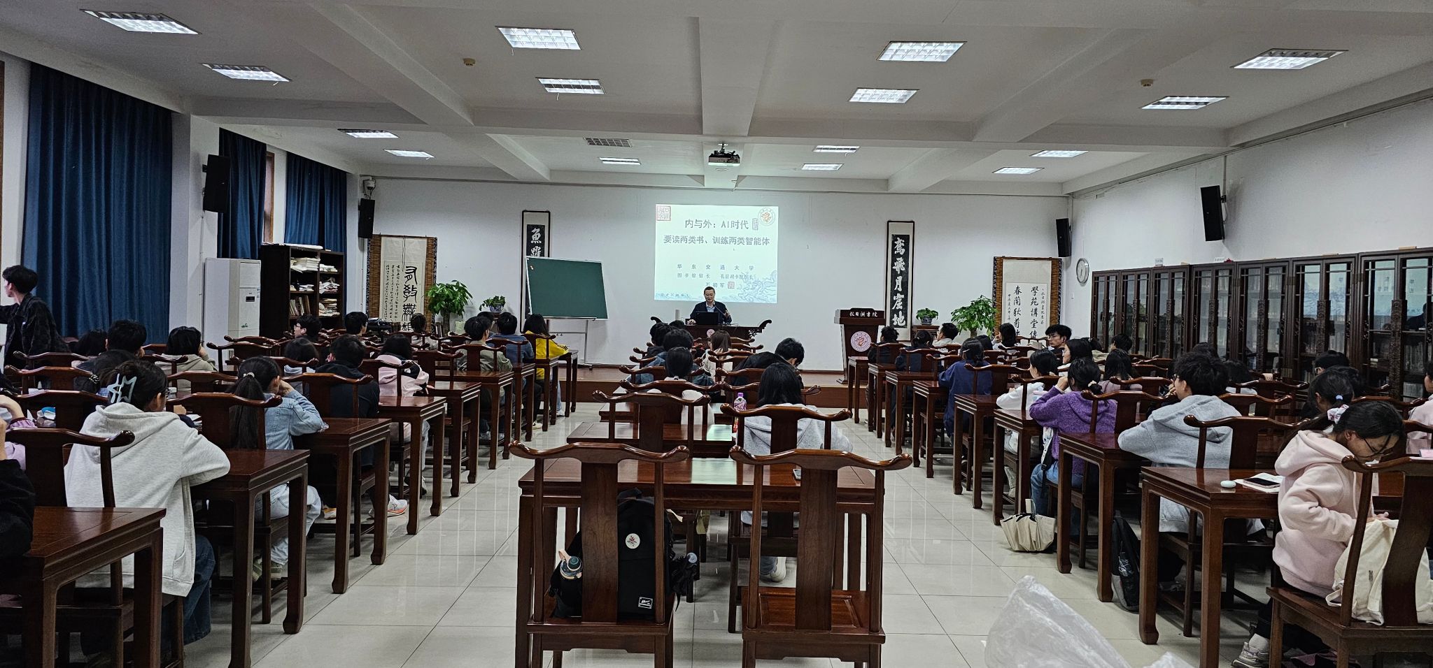 4月23日世界读书日,我馆举办第16届校园读书月系列活动之一——专题讲座,馆长石初军为明德社、读者学社等多个学生社团社员,以及图书馆学生馆员、志愿服务者近百人开讲,主题为《内与外:AI时代要读两类书、训练两类智能体》。